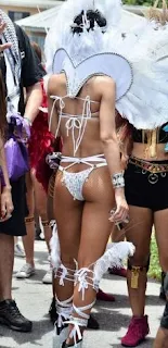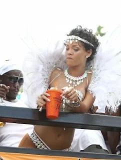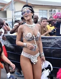 The pop star, Rihanna, attended the Barbados Carnival on Saturday (3), and on Monday honored the street parade with a group of friends using a micro fantasy, consisting of a bikini with jewels and ornaments with feathers on the shoulders and head, looking to a Brazilian dancer.