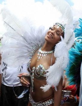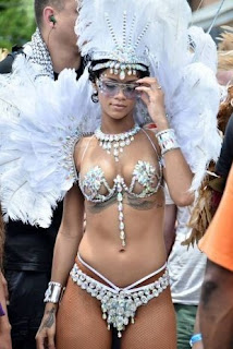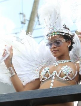 The pop star, Rihanna, attended the Barbados Carnival on Saturday (3), and on Monday honored the street parade with a group of friends using a micro fantasy, consisting of a bikini with jewels and ornaments with feathers on the shoulders and head, looking to a Brazilian dancer.