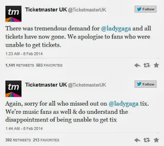 "There was a tremendous demand for Lady Gaga and all tickets have now gone. We apologize to fans who could not buy tickets," twitted the official UK Ticket Master.