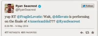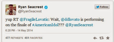 "yup RT @FragileLovatic: Wait, @ddlovato is performing on the finale of #AmericanIdol??? @RyanSeacrest"