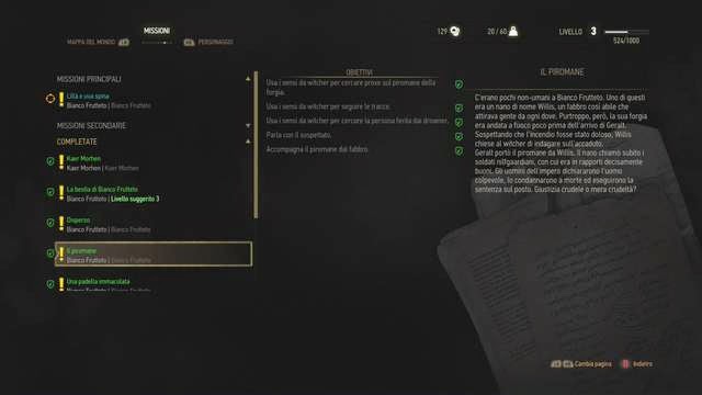 INFORMATION: The gunsmith will engage you to find out who burned his shop. Use your senses to Witcher to follow in the footsteps of the perpetrator to the river. Look for the point where the tracks reappear and examined the shoes and the blood. Continue to find an injured man at the end of the runway track. Use the Mental manipulation to bring the Nano that will execute by the army. Now you can return to the ARMAIOLO activities.
