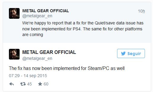 Konami has announced that the bug affecting the saved game Metal Gear Solid 5: The Phantom Pain has been fixed in PlayStation 4 and PC. This patch will be available on other platforms soon. It has also been said that work to improve connection problems with servers.