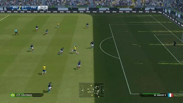 Even with identical shirts, it's easy to see the superiority of PES 2016. Modeling the background, stadium roof details - and even the crowd - draw attention to the excellent graphics of the latest title.